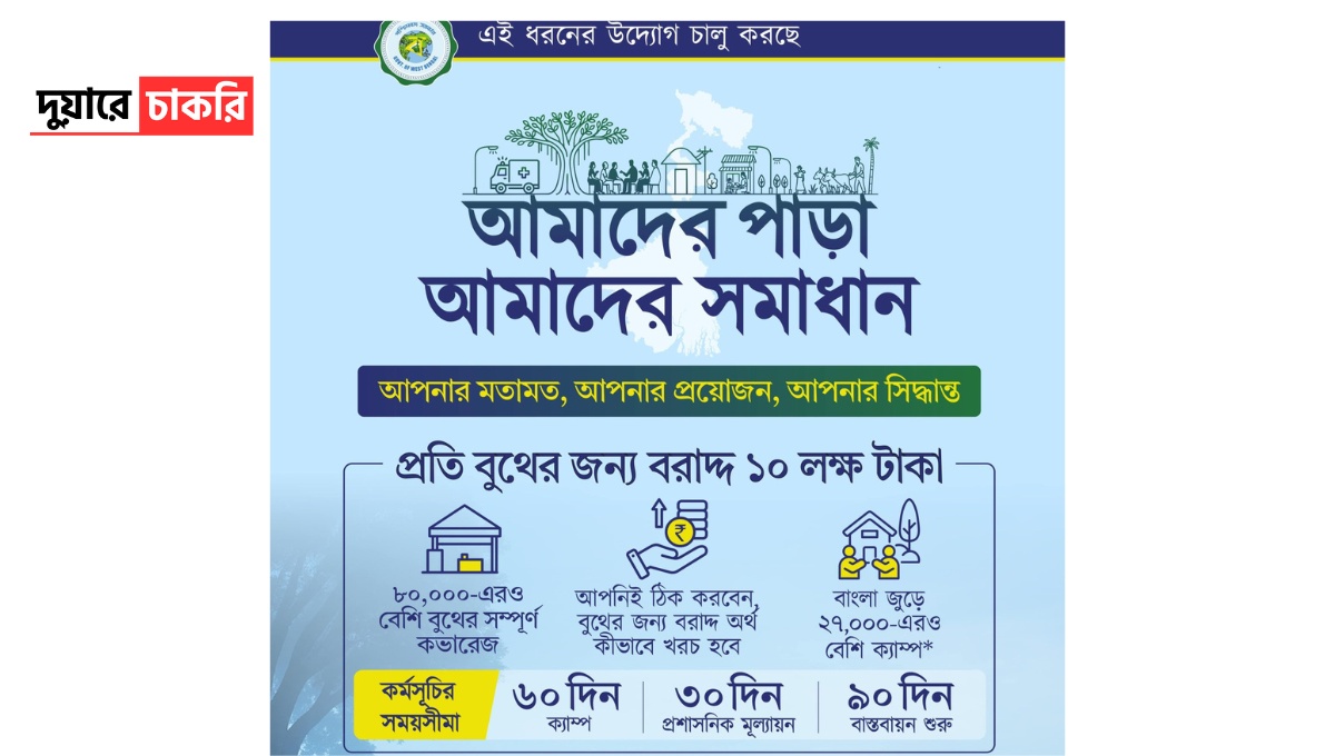 পশ্চিমবঙ্গ সরকার “আমাদের পাড়া আমাদের সমাধান” প্রকল্পের মাধ্যমে মানুষের কাছে পৌঁছাতে চায়, তাদের কথা শুনতে চায়, এবং প্রতিটি সমস্যা সমাধানের প্রতিশ্রুতি রাখতে চায়। তাই আর অপেক্ষা নয়, আজই ওয়েবসাইটে গিয়ে জেনে নিন আপনার এলাকার ক্যাম্পের সময় ও স্থান, এবং সক্রিয়ভাবে অংশগ্রহণ করুন।