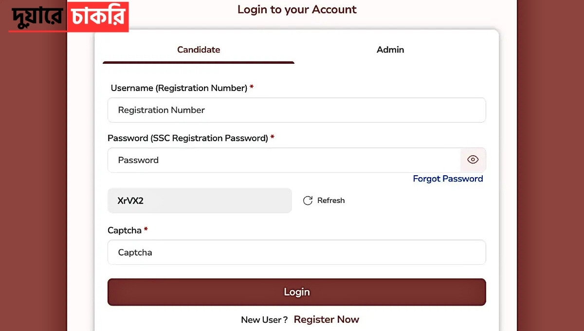 আপনার ইউজারনেম বা রেজিস্ট্রেশন নম্বর এবং SSC পাসওয়ার্ড লিখে লগইন করুন।